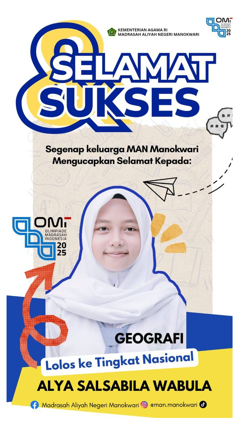 Humas_MAN Manokwari, Papua Barat - Kabar membanggakan datang dari MAN Manokwari! Salah satu peserta didik MAN Manokwari, Alya Salsabila Wabula siswi Kelas XII (Soshum), berhasil melaju ke tingkat nasional dalam Olimpiade Madrasah Indonesia (OMI) 2025 pada mata pelajaran Geografi.